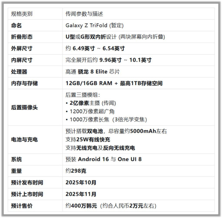 该设备预计于10月21日左右亮相,将配备10英寸三折叠OLED显示屏、2亿像素三摄系统以及由三部分组成的电池,这将使三星成为继华为之后第二家发布三折叠手机的厂商。